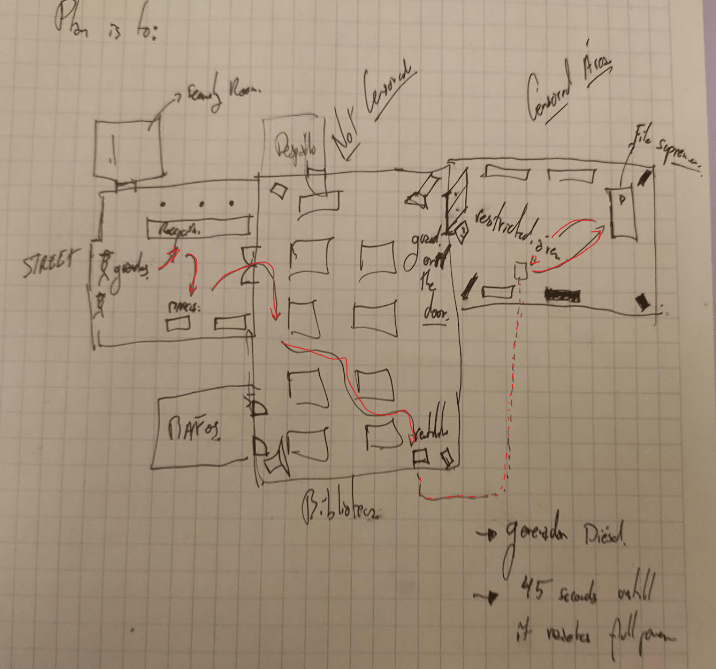 Mira esto es la zona de biblioteca pública, creo que hay guardas de seguridad aquí, aquí y aquí. Y según el plano eléctrico hay cámaras de seguridad aquí y aquí. El cuarto de la cultura anterior a la revolución está a este otro lado de la puerta, pero para poder entrar se necesita la clave personal, además, acuérdate que siempre estás acompañado por el gerente del archivo y un guarda de seguridad.