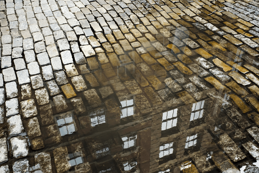 Vemos el edificio de oficinas de Galilea reflejado en un charco de lluvia y posteriormente cómo lo pisa un pie que se dirige hacia él.